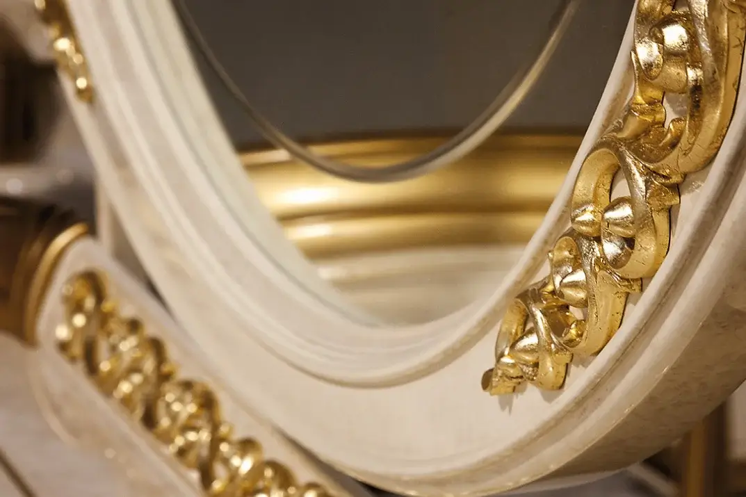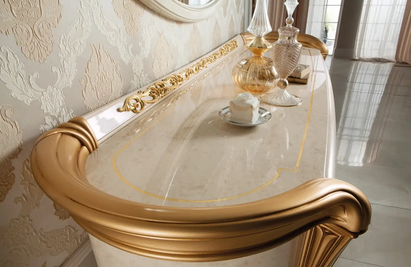 Une collection aux lignes douces et romantiques qui nous ramène aux atmosphères néoclassiques avec une touche art déco qui embellit, avec les nombreuses frises et arabesques, les détails de votre mobilier.