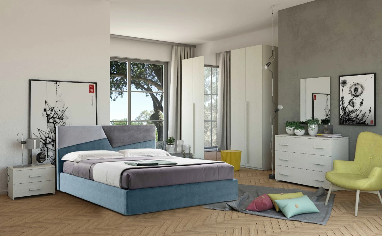 - Lit : Cadre en MDF avec tissu anti-tache et tête de lit intégrée